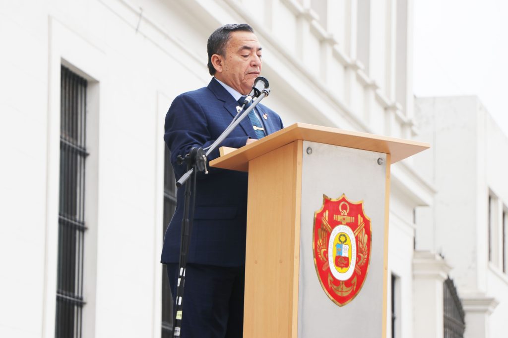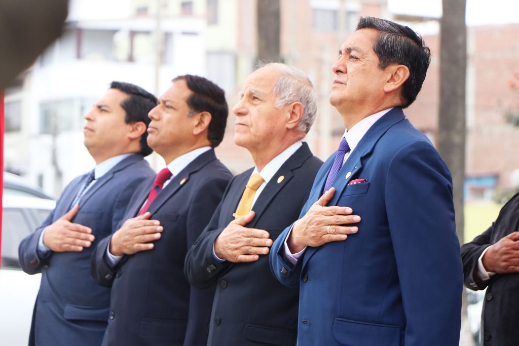 Durante la ceremonia, el izamiento del sagrado Pabellón Nacional estuvo a cargo del Gerente General de GIGAMAS S.A.C, Abogado Ysrael Acuña Raya, quien también es egresado de la VII Maestría en Inteligencia Estratégica del CAEN. Este acto simbólico representó el compromiso permanente de los egresados de nuestra casa de estudios con los más altos valores de la Nación, el respeto a nuestros símbolos patrios y la vocación de servicio al país desde todos los ámbitos del quehacer profesional.