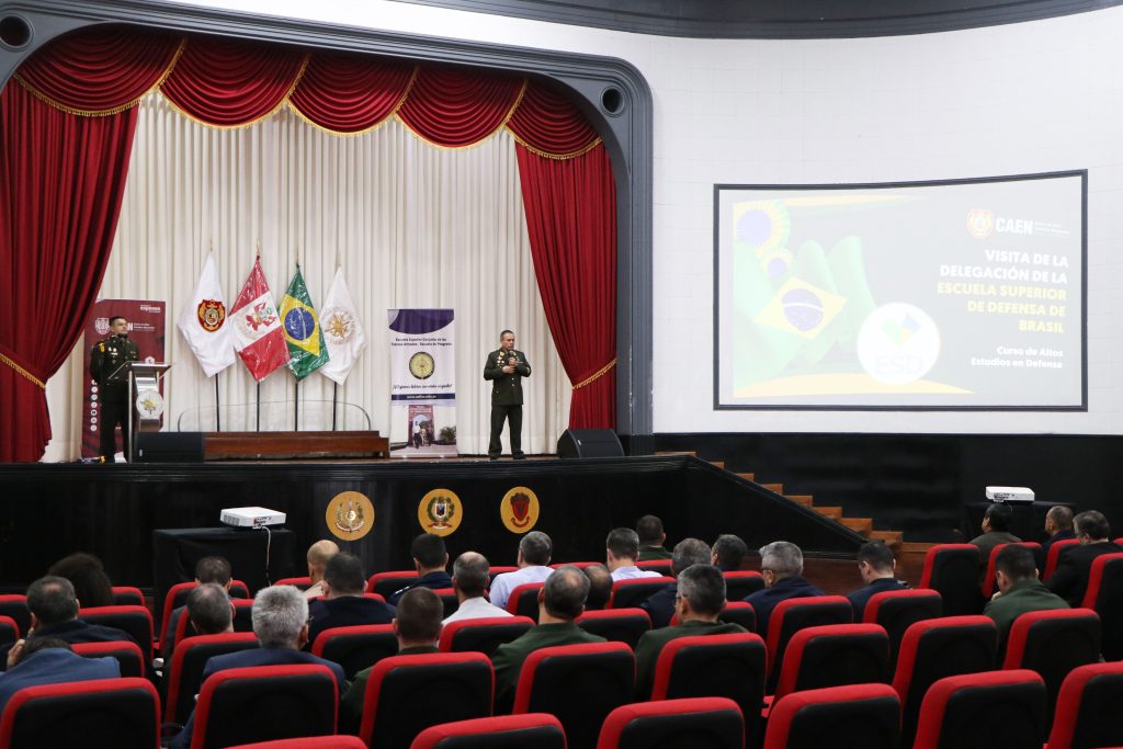 Chorrillos, 14 de octubre de 2025.– En el auditorio «Andrés Avelino Cáceres», el CAEN recibió la visita de una delegación de alumnos delCurso de Altos Estudios en Defensa (CAED) de la Escuela Superior de Defensa de Brasil, en el marco de su viaje de estudios.