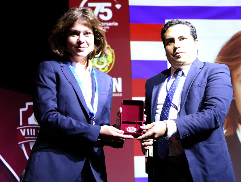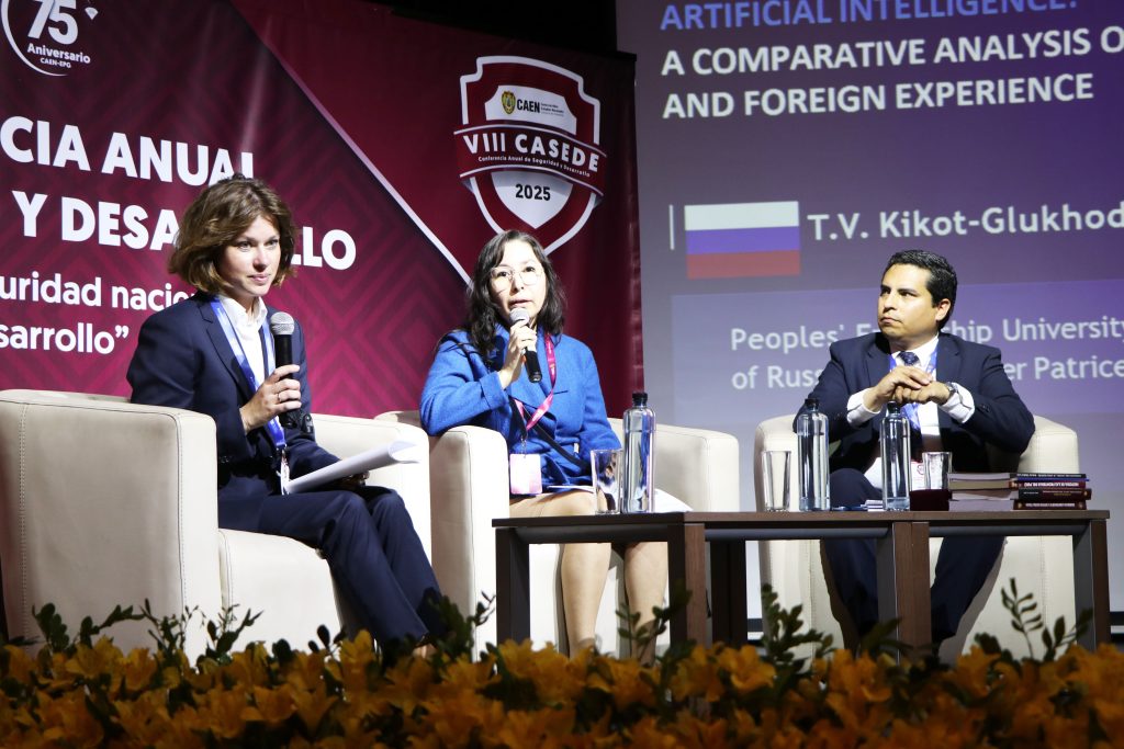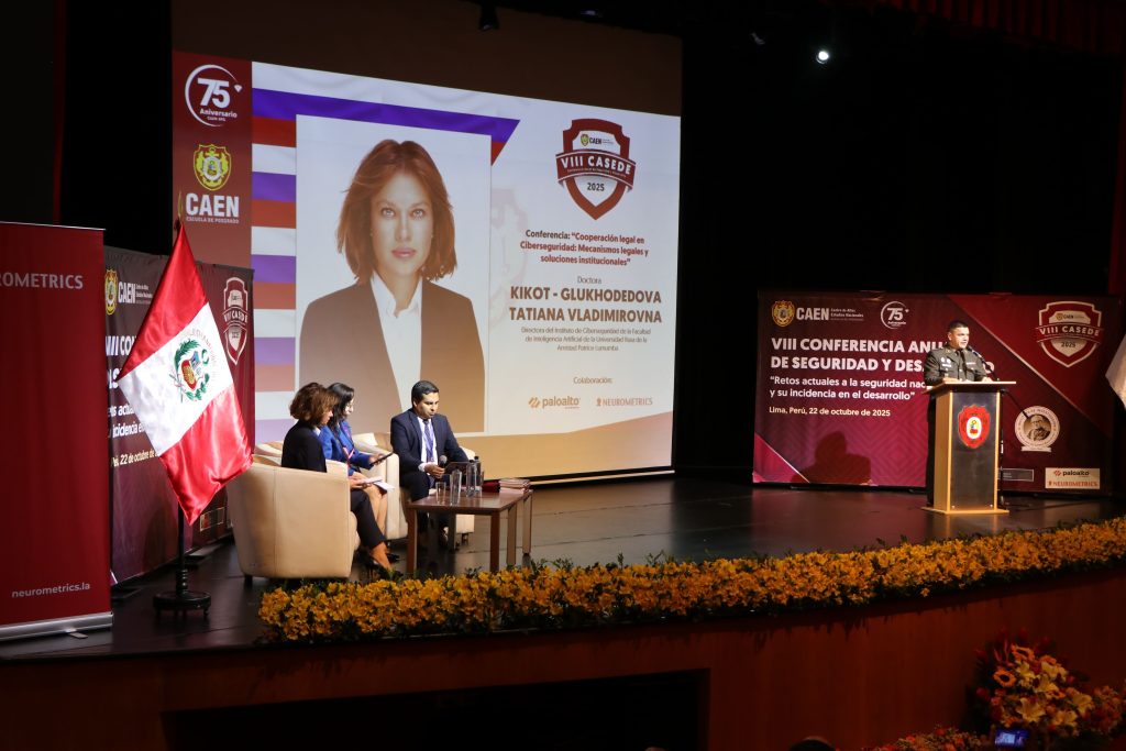 Seguidamente, la Doctora Tatiana Kikot, Directora del Instituto de Ciberseguridad de la Universidad RUDN de Rusia, abordó los desafíos emergentes de la ciberseguridad en el contexto de las nuevas amenazas globales. En su intervención, enfatizó la necesidad de fortalecer los marcos legales y las capacidades tecnológicas de los Estados frente al cibercrimen y la desinformación digital, factores que hoy inciden directamente en la seguridad nacional y en la confianza pública.