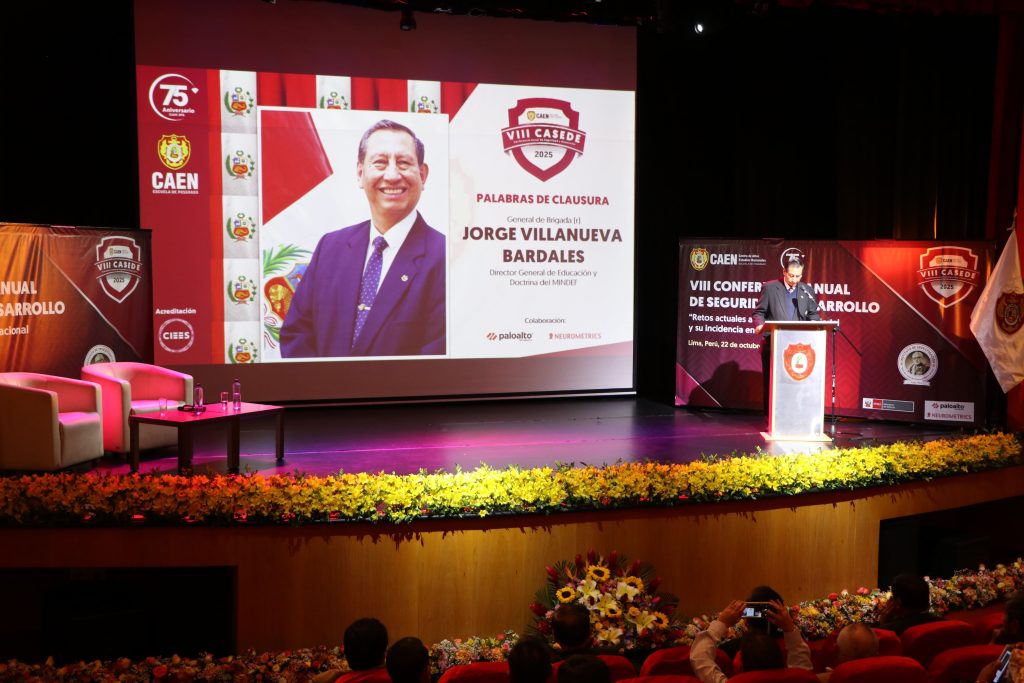 La VIII CASEDE 2025 culminó con las palabras de clausura del General de Brigada Jorge Villanueva Bardales, Director General de Educación y Doctrina del Ministerio de Defensa, quien destacó el valioso aporte de los ponentes y la relevancia del CAEN como centro estratégico del pensamiento nacional en materia de seguridad y defensa.