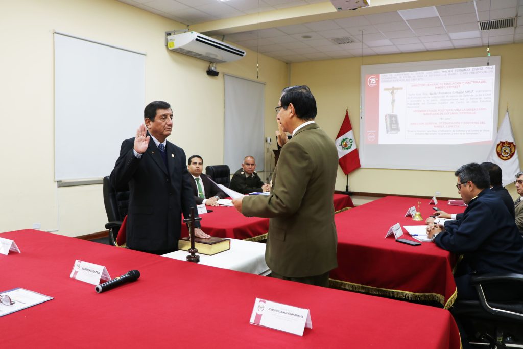 Durante la sesión, se realizó la juramentación del Viceministro de Políticas para la Defensa, General de Brigada Walter Chávez Cruz, como Presidente del Consejo Superior del CAEN, quien asumió el cargo reafirmando su compromiso con el fortalecimiento institucional y el desarrollo académico del CAEN.