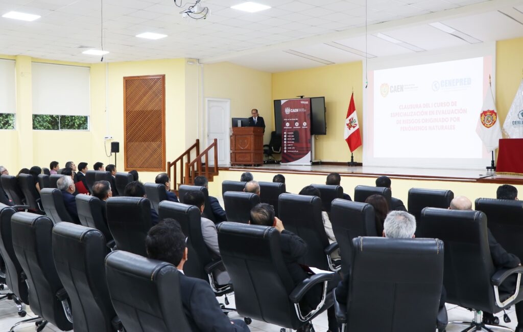 Chorrillos, 18 de noviembre de 2025. El Centro de Altos Estudios Nacionales (CAEN) y el Centro Nacional de Estimación, Prevención y Reducción del Riesgo de Desastres (CENEPRED), llevaron a cabo la ceremonia de clausura del Primer Curso de Especialización en Evaluación del Riesgo Originado por Fenómenos Naturales, evento desarrollado con la participación de autoridades, docentes y participantes.