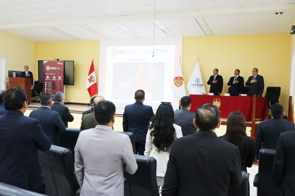 El acto contó con la presencia del General de Brigada (r) Rolando Gustavo Capucho Cárdenas, Jefe Institucional del CENEPRED; del Dr. Edwin Cruz Aspajo, Director General (e) del CAEN; y del General de Brigada (r) Juan Fernando Ormachea Montes, Director Académico del CAEN.